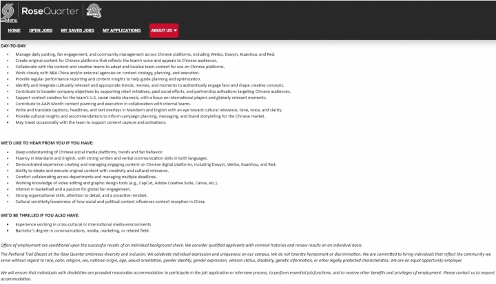 我们理想的候选人是一位富有创意、精通文化的叙事者,对中国社媒平台、趋势和粉丝行为有着深刻的理解,精通普通话和英语,擅长为中美两国的平台量身定制引人入胜的内容,并热衷于将全球观众与篮球联系起来。我们正在寻找一位能够为我们不断壮大的内容团队带来创造力、适应能力的强大协作能力的人才。