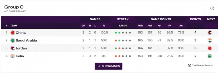 C组的形势,中国男篮目前2胜0负小组第一,沙特1胜1负第2,约旦1胜1负第3,印度0胜2负第4。