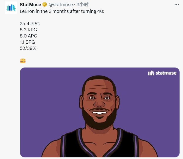 8月9日讯 今日数据媒体StatMuse晒出詹姆斯年满40岁之后3个月的场均数据,并配文:👑。