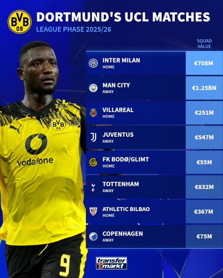 多特欧冠对手身价:曼城12.5亿欧最高,热刺8.32亿&国米7.08亿