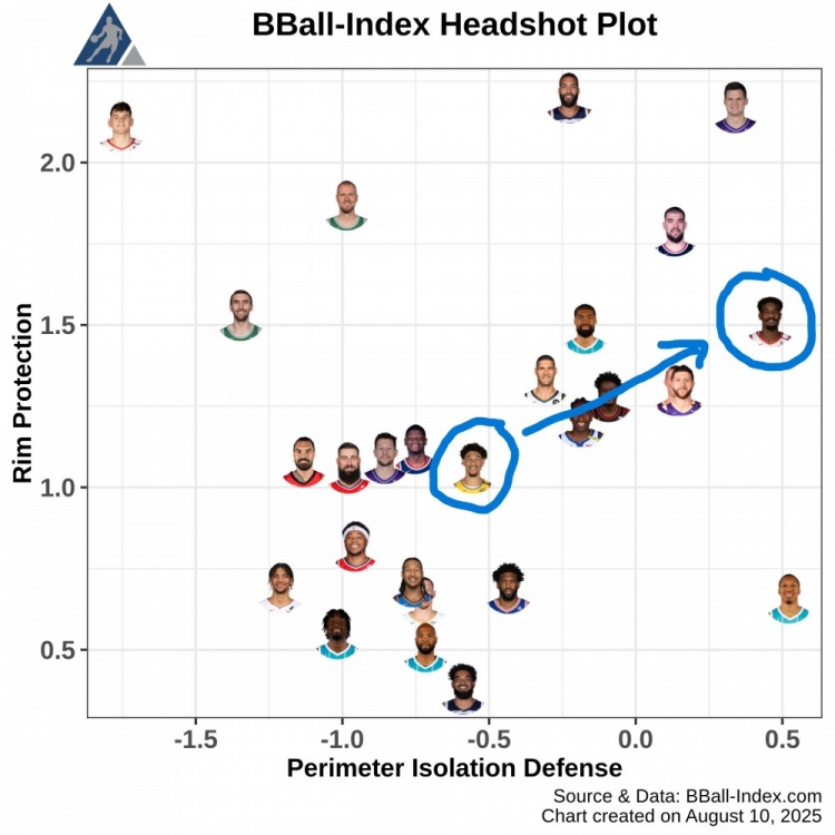 Cranjis McBasketball给出了一张2024-25赛季站桩型内线的护筐与外线单防能力象限图,其中纵坐标数值越大表示护筐能力越强,横坐标数值越大表示外线单防能力越强。