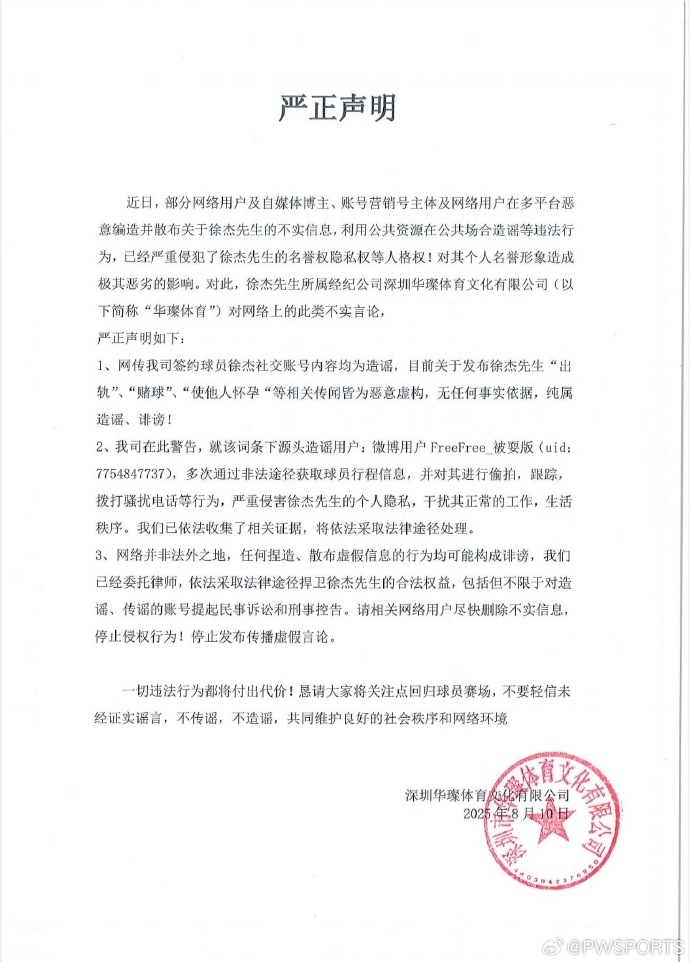 近日,部分网络用户及自媒体博主、账号营销号主体及网络用户在多平台恶意编造并散布关于徐杰先生的不实信息,利用公共资源在公共场合造谣等违法行为,已经严重侵犯了徐杰先生的名誉权隐私权等人格权!对其个人名誉形象造成极其恶劣的影响。对此,徐杰先生所属经纪公司深圳华璨体育文化有限公司(以下简称“华璨体育”)对网络上的此类不实言论,