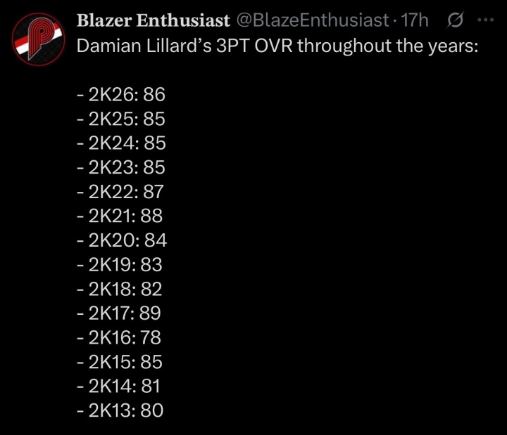 开拓者西班牙球迷账号BLAZERS ARGENTO晒出了2K各代利拉德的三分能力值并转发了该榜单:“我觉得很有趣的是,2K从来没有将利拉德放入三分射手的前十中,尽管他是历史上第二好的射手。”
