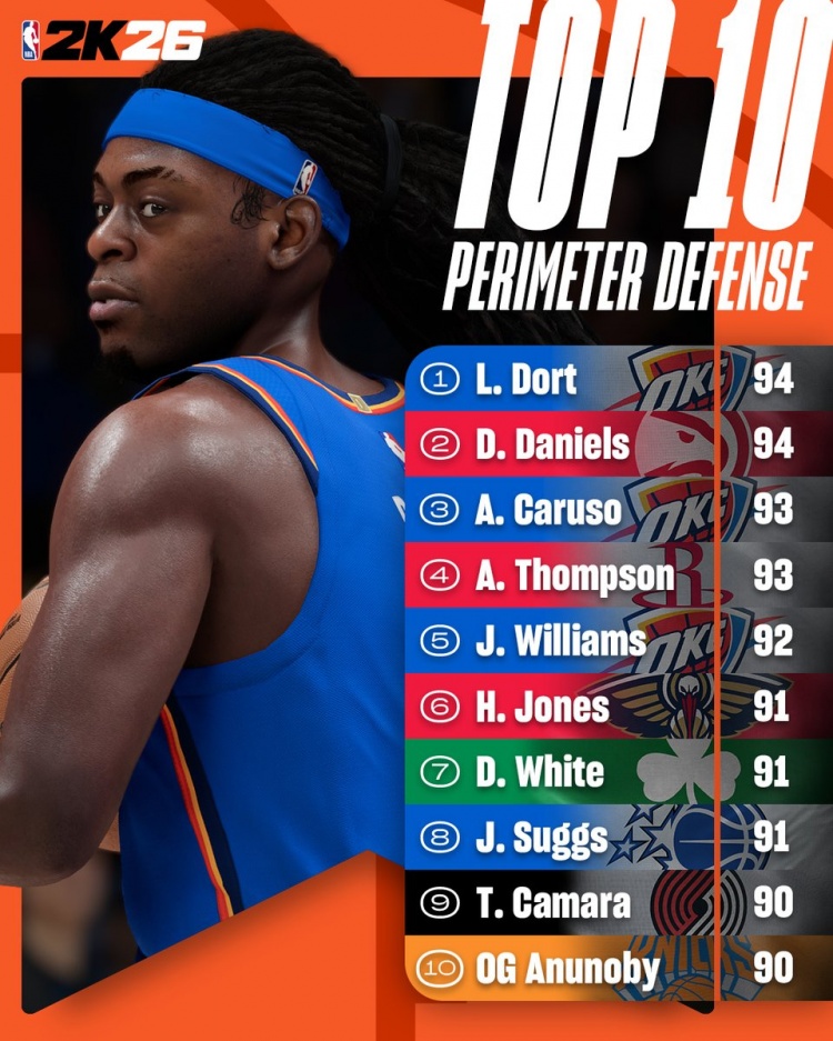 08月16日讯 NBA2K官方晒出了NBA2K26外线防守能力值前十的球员,具体如下: