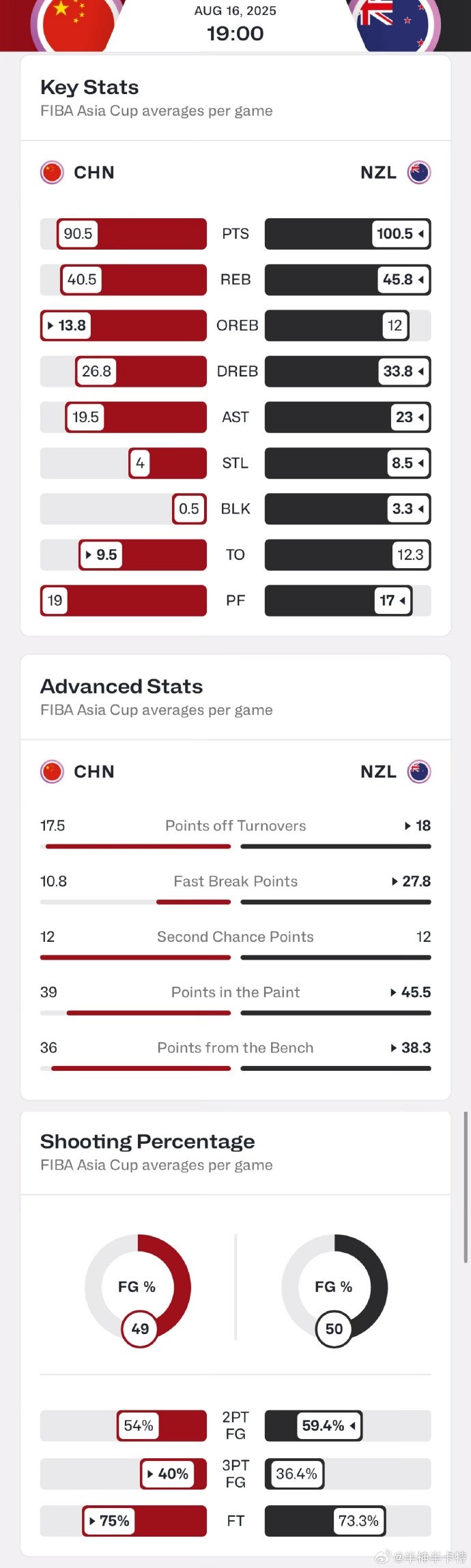 FIBA官网给出的中国、新西兰赛前数据对比,整体来看,中国男篮处于绝对劣势。但我觉得这未必是坏事,进四强已经达到预期,放下包袱、轻装上阵,以下狗心态放手一搏,也许会有奇效。 ​​​