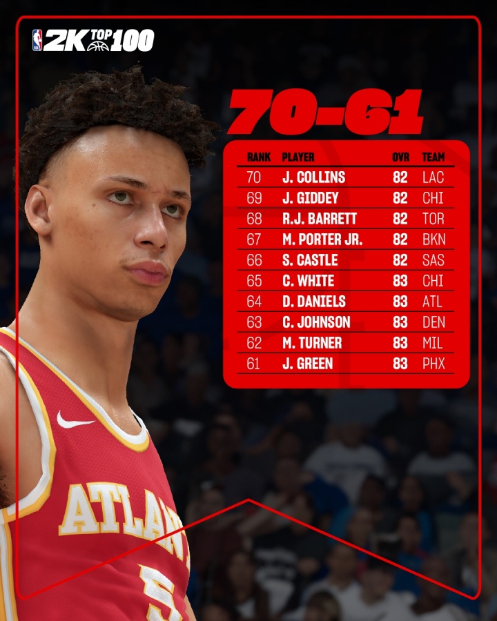 2K能力值排名第70-51:约翰-科林斯第70 杰伦-格林第61 贝恩第60