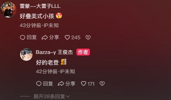 雷蒙回复王俊杰:好滴美式小孩😍王俊杰:好的老登😉