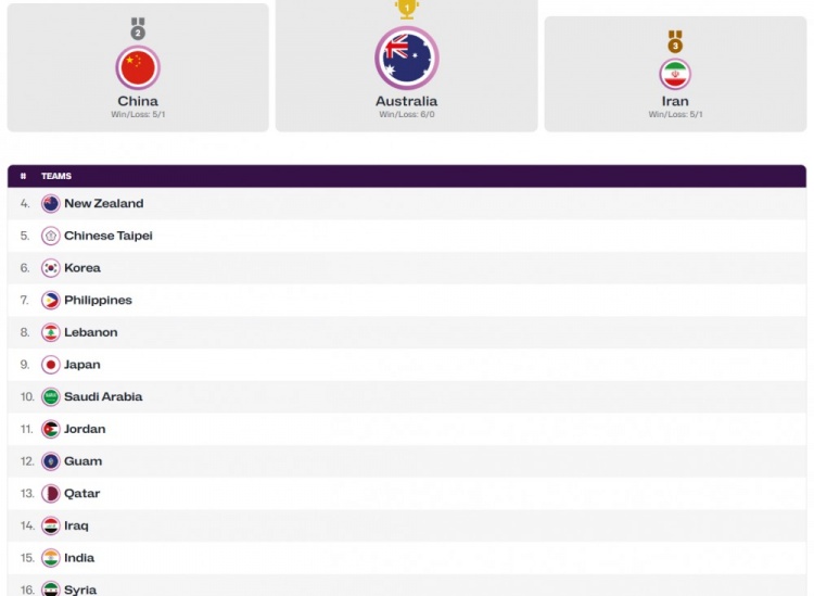 比赛结束后,FIBA亚洲杯官网公布了本届亚洲杯的最终排名,澳大利亚、中国、伊朗前3。