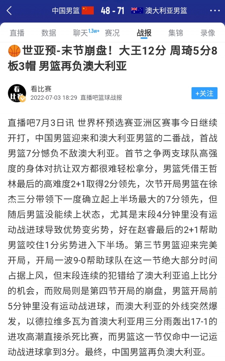 值得一提的是,中国男篮上一次和澳大利亚交手是在2022年的世界杯亚洲预选赛上,那场比赛中国队48-71大败。