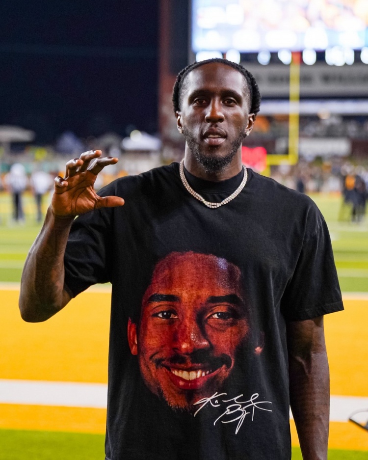 普林斯回母校贝勒大学参加活动 穿着一件印有科比照片的T恤