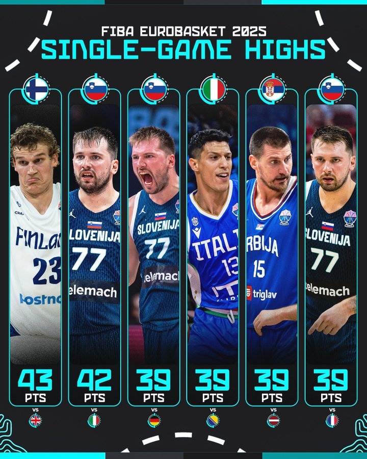 本届欧锦赛单场得分前6:马尔卡宁43分居首 东契奇占半壁江山