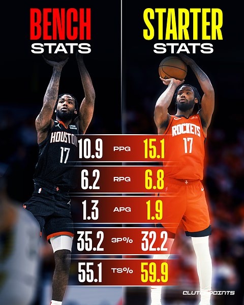 9月30日讯 美媒Clutchpoints晒出了火箭球员塔里-伊森上赛季打先发和打替补时的数据对比。先发登场的16场比赛...