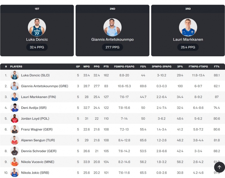 欧锦赛小组赛得分榜:东契奇场均32.4分傲视群雄 字母哥命中率逆天