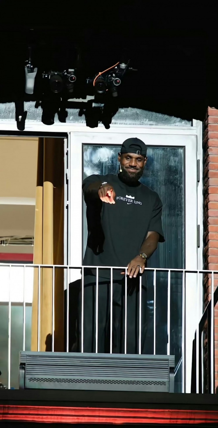 中国行上海站活动开始前 詹姆斯从高处张开双臂向球迷问好