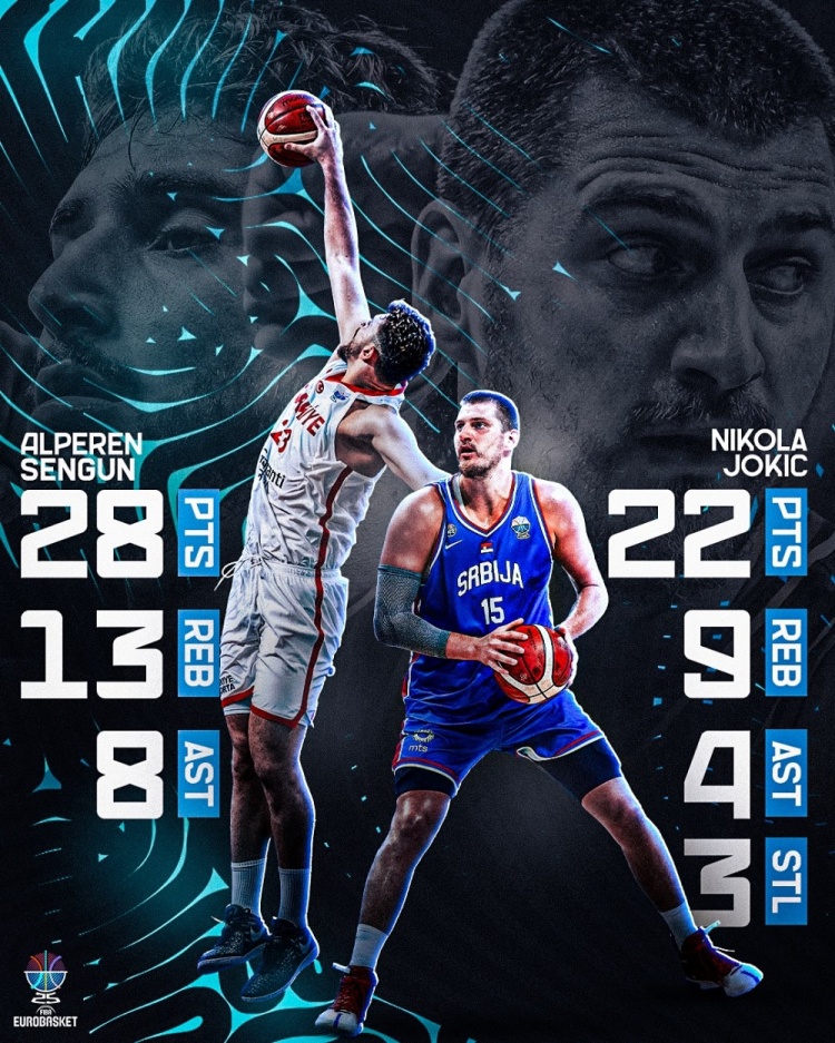 9月4日讯 欧锦赛小组赛,土耳其95-90险胜塞尔维亚。赛后,欧锦赛官方发布申京VS约基奇数据海报,并写道:“我们刚刚目...