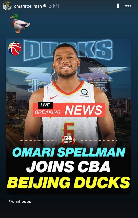 09月03日讯 曾经在勇士队效力过的内线外援斯佩尔曼自宣加盟北京首钢男篮,他在个人社交媒体上转发了相关报道,并配上一个🦆...
