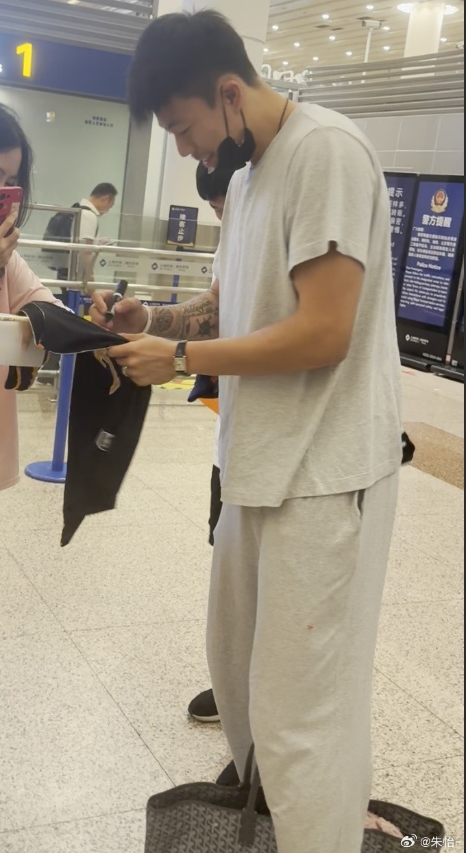 张镇麟落地上海浦东机场与球队会和 面带笑容给球迷的球衣签名