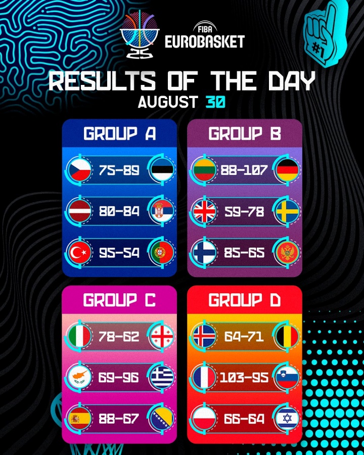 08月31日讯 男篮欧锦赛当地时间8月30日的12场小组赛全部结束,详细赛果如下:A组:捷克75-89爱沙尼亚捷克:克雷...