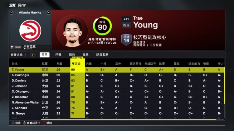 2K26老鹰能力值:特雷-杨90全队最高 新援波尔津吉斯85第二