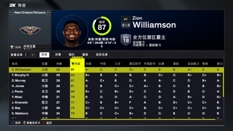 2K26鹈鹕能力值:锡安87&普尔80 德章泰-穆雷&赫伯特-琼斯均为81