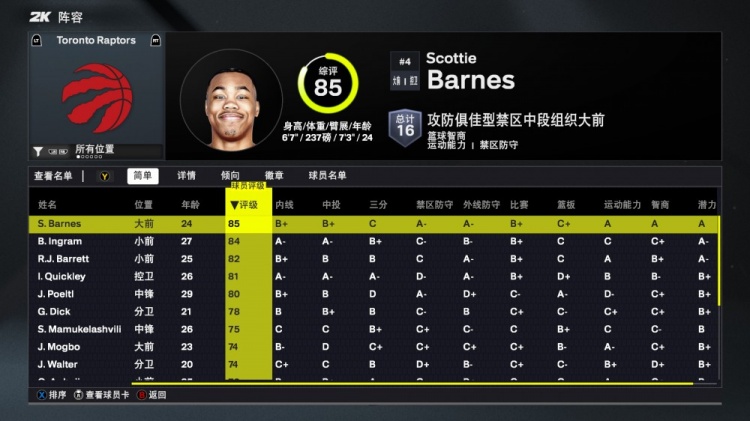 8月30日讯 今日NBA 2K26正式发布,猛龙队球员能力值如下:全队有5人能力值80+,其中巴恩斯85排在第一,英格拉...