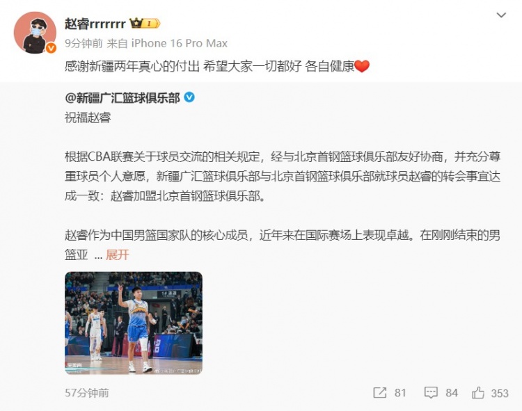 赵睿致谢新疆队:感谢两年真心的付出 希望大家一切都好 各自健康