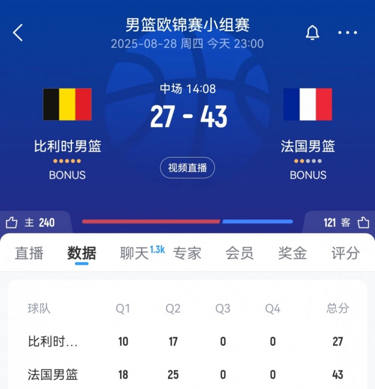 8月28日讯 男篮欧锦赛小组赛,法国男篮半场43-27领先比利时男篮。上半场,法国男篮多点开花,全队12人均有得分进账,...
