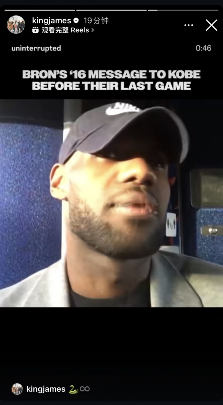 8月25日讯 湖人前锋詹姆斯更新Instagram Story动态。詹姆斯转发了他在2016年生涯最后一次与科比交手前录...