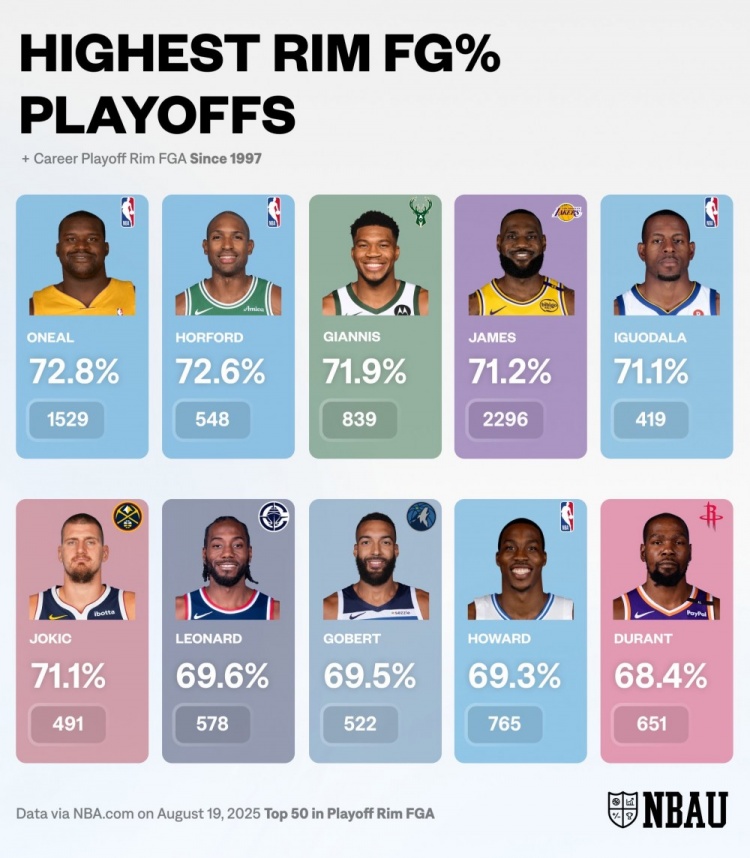 97年以来季后赛篮下高效得分手:奥尼尔 霍福德 字母哥 詹姆斯前4