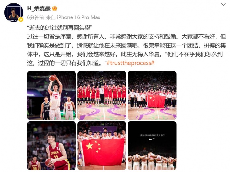 8月18日讯 男篮亚洲杯决赛,中国男篮89-90惜败澳大利亚,获得亚军。中国男篮球员余嘉豪发文总结了本次亚洲杯,其写道:...