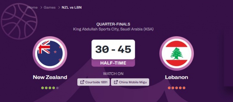 外线哑火!新西兰队上半场三分11中0 对手黎巴嫩三分20中7