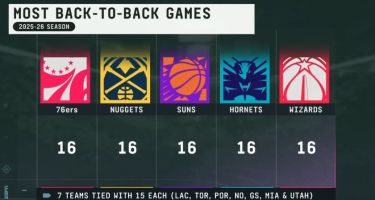 新赛季背靠背次数:76人掘阳蜂奇5队16场最多 勇船15场 湖火14场
