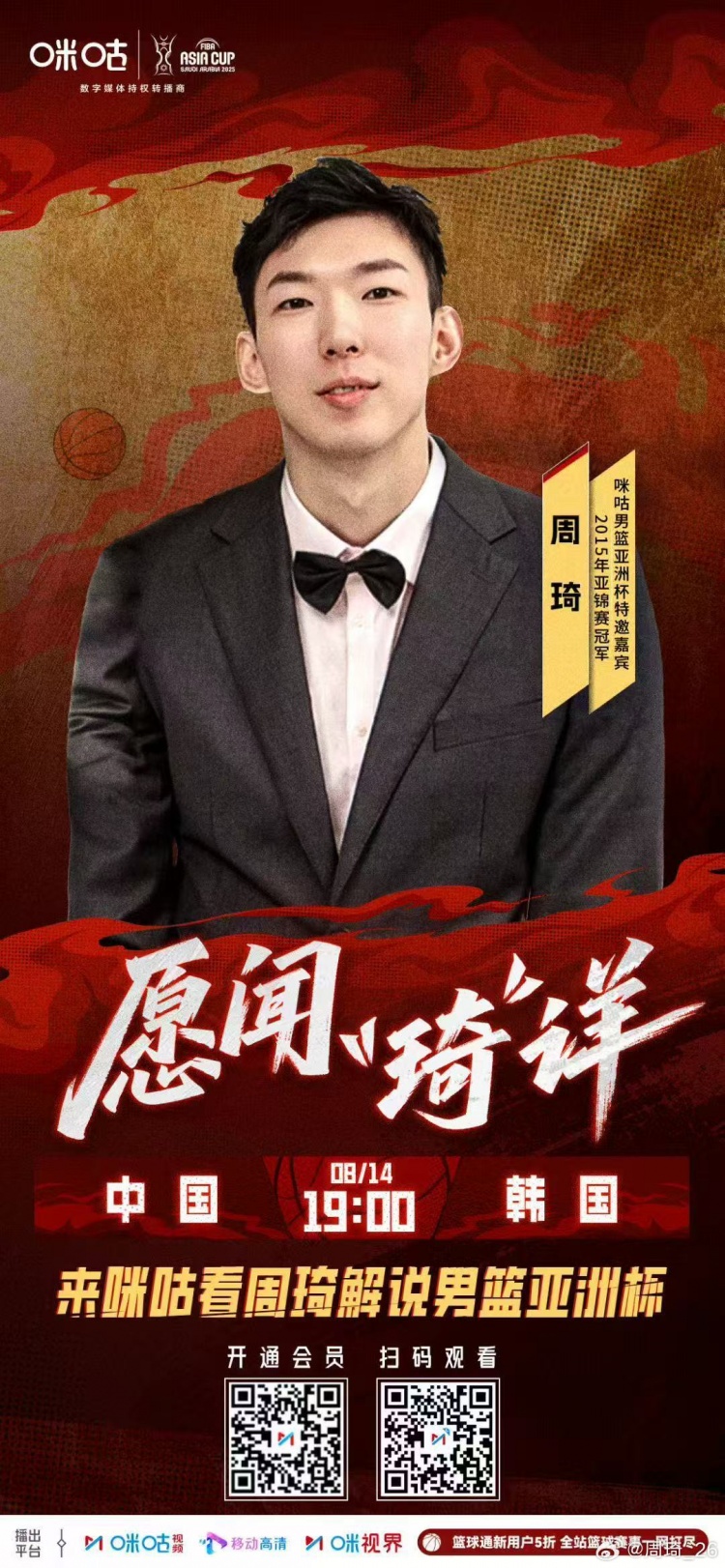 担任亚洲杯中韩大战解说嘉宾 周琦发博晒海报预热焦点战