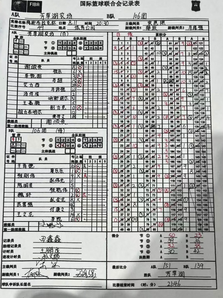 08月14日讯 11日,野球比赛芳草湖农场151-139击败106团。其中,芳草湖农场3号球员李锐超本场比赛命中38记三...