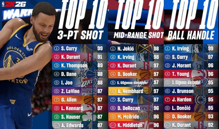 库里目前公布的2K26能力值:三分99断档第一 中投97&控球97