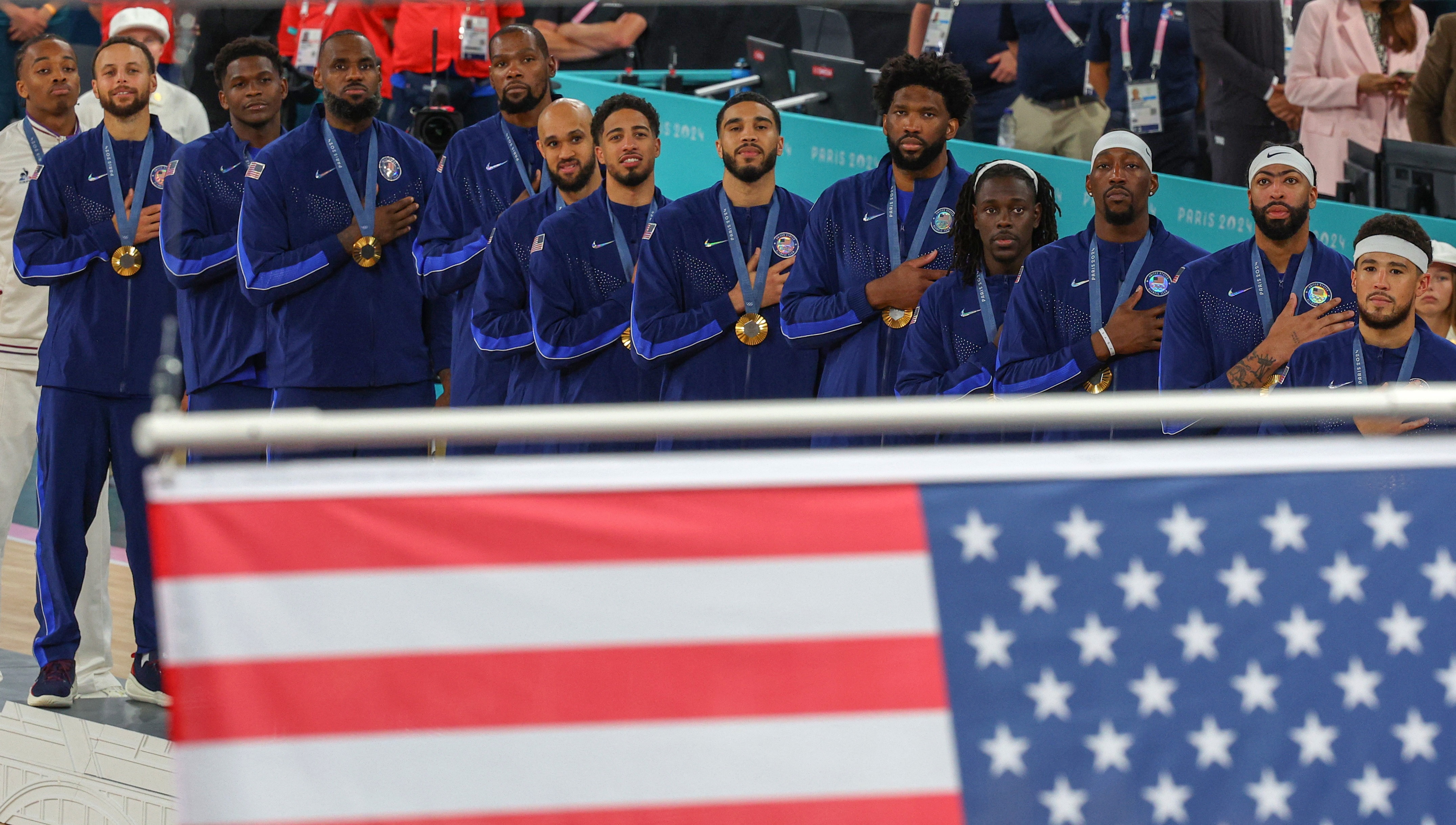 8月11日讯 一年前的今天,美国队在巴黎奥运会男篮决赛中击败法国队,赢得奥运男篮金牌。凯尔特人官推晒出塔图姆夺金的照片,...