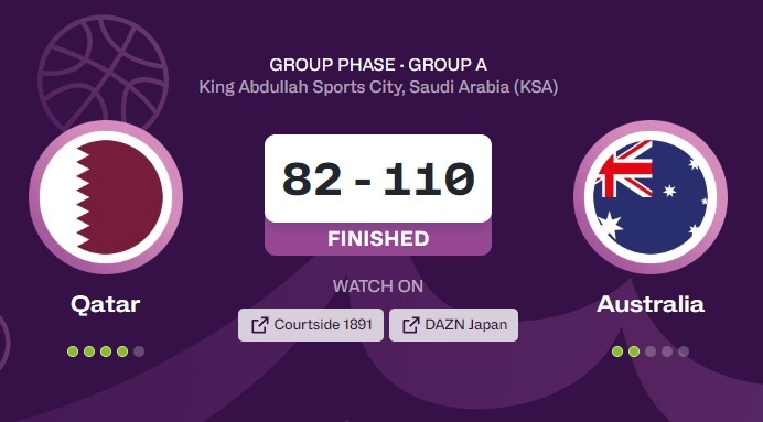 澳大利亚110比82大胜卡塔尔 3战全胜锁定A组第1 晋级1/4决赛