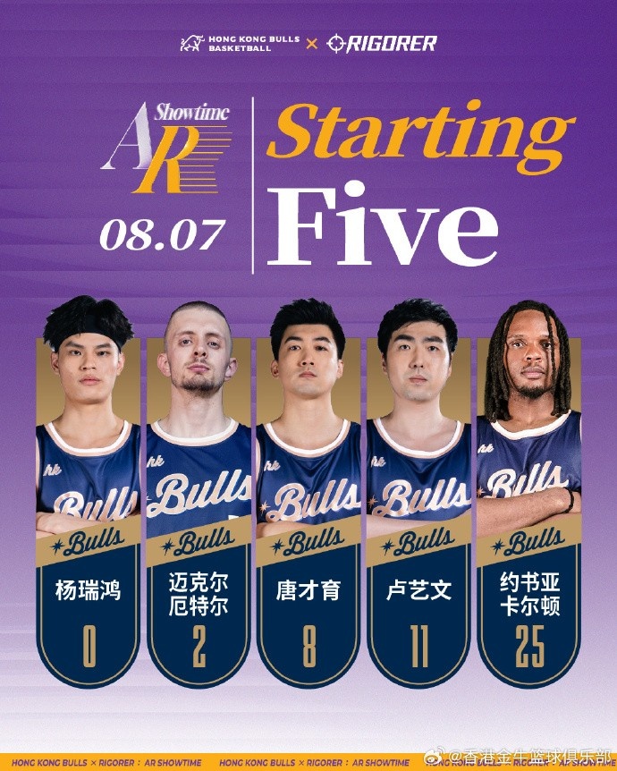 香港金牛队今日首发阵容:杨瑞鸿、厄特尔、唐才育、卢艺文、卡尔顿Let's Go Bulls!...