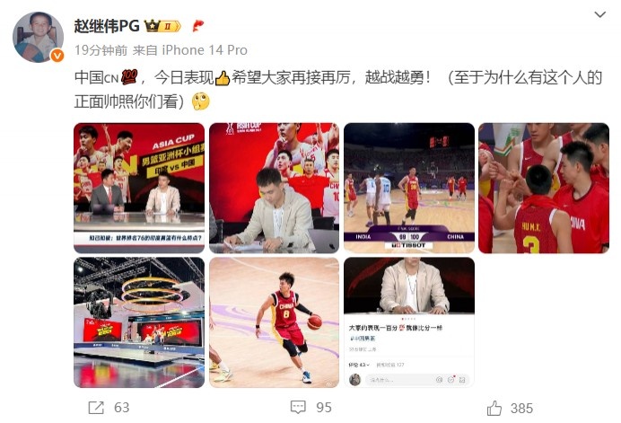 8月7日讯 男篮亚洲杯小组赛,中国100-69大胜印度。赛后,担任本场解说嘉宾的辽宁男篮球星赵继伟更新个人社媒,晒出自己...
