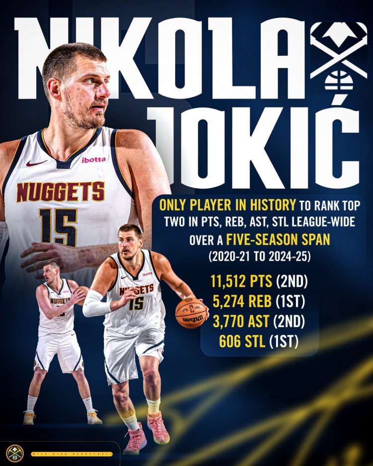 约基奇近5季得分篮板助攻抢断皆联盟前2!掘金:世界最佳 无争议