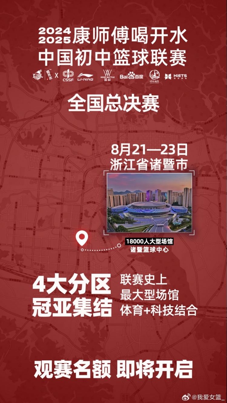 据@篮战-Hoopbattle官方消息,2024-2025中国初中篮球联赛全国总决赛将于8月21-23日在浙江省诸暨市诸...