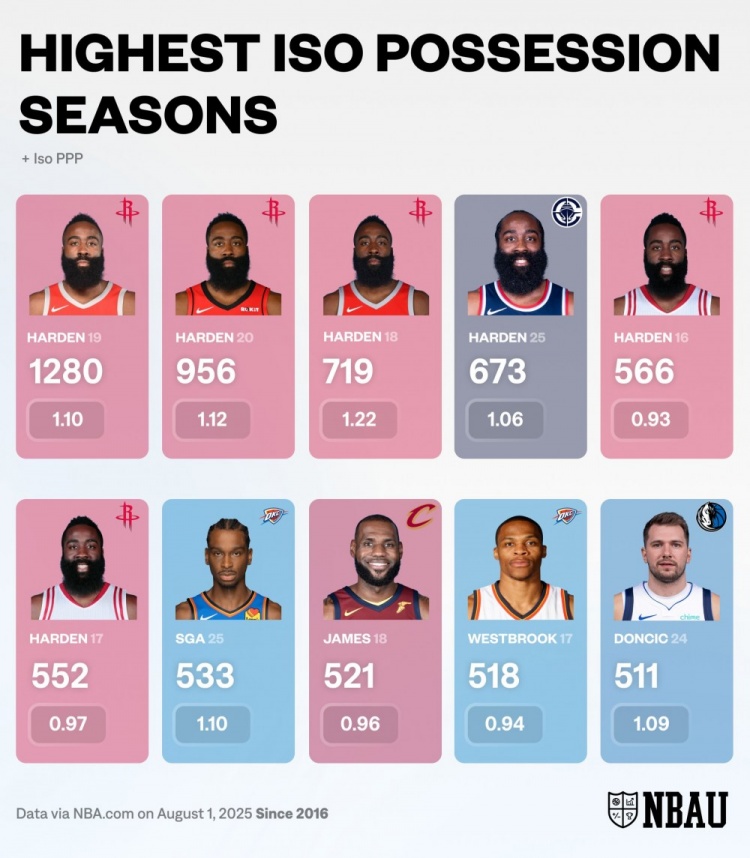美媒晒过去10年赛季单打次数榜:哈登包揽前6