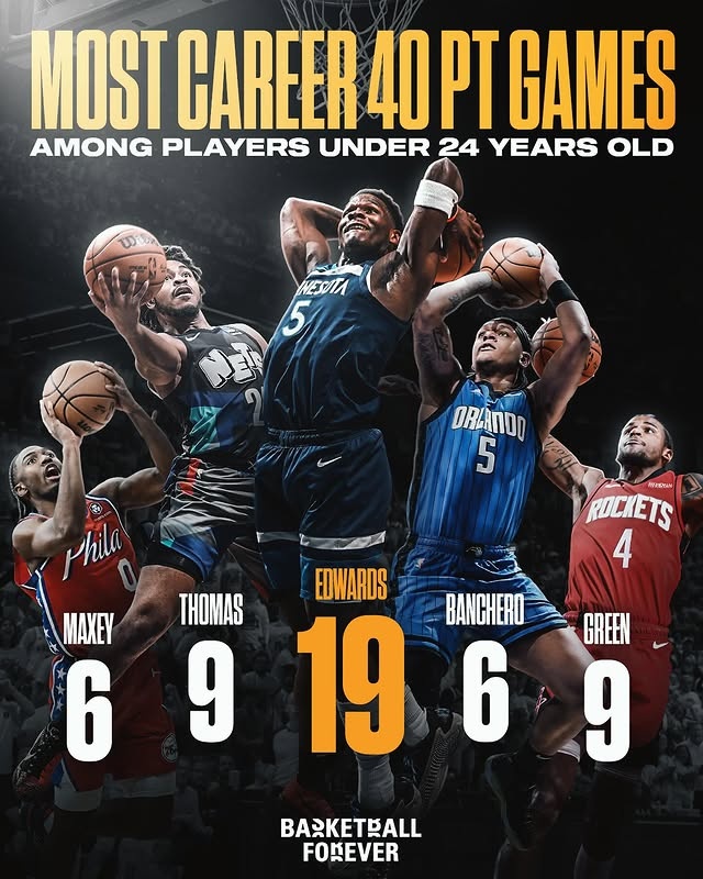 当今联盟24岁以下球员40+场次:爱德华兹 19场杰伦-格林/托马斯 9场马克西/班凯罗 6场...