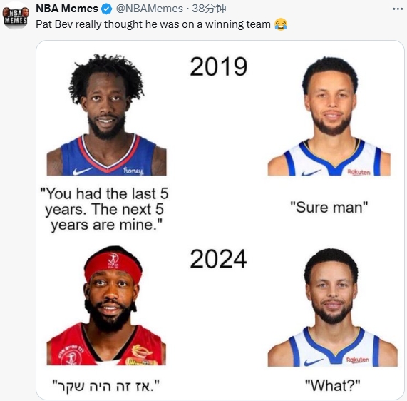 07月28日讯 近日,媒体NBA Memes在社交媒体上晒出了一张图调侃了前NBA球员帕特里克-贝弗利(如上)。2019...