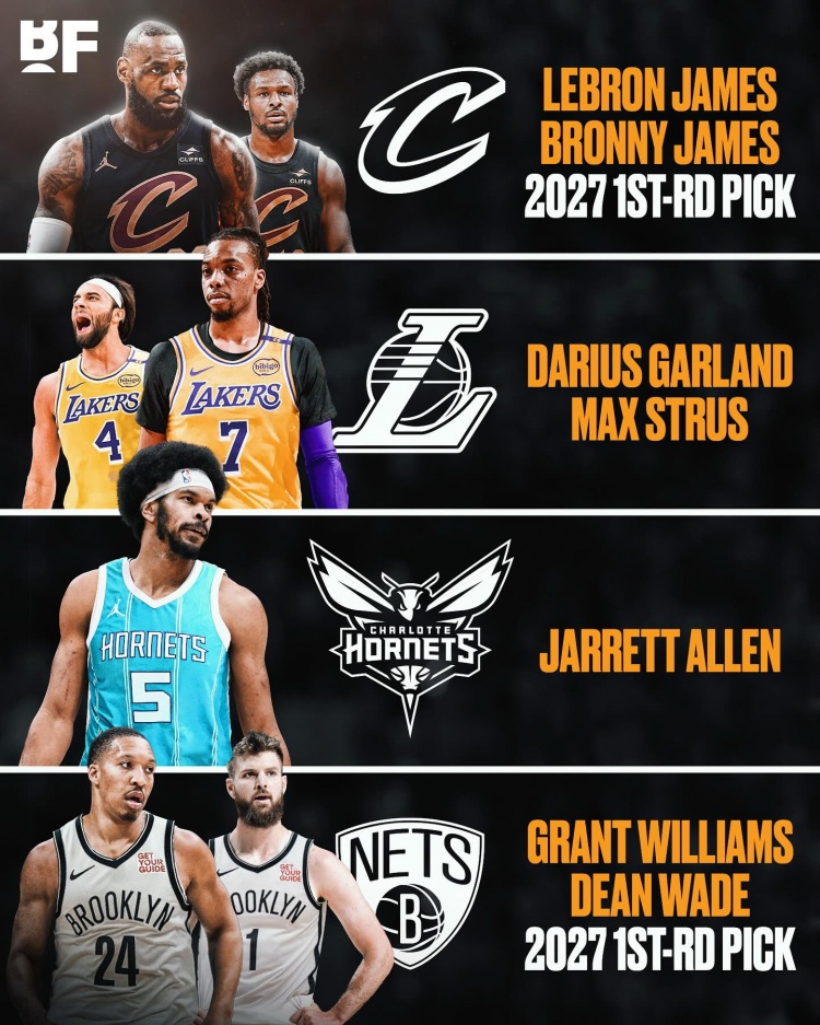 骑士得到:勒布朗-詹姆斯、布朗尼、2027年首轮签;湖人得到:加兰、斯特鲁斯;黄蜂得到:贾雷特-阿伦;篮网得到:格兰特-...