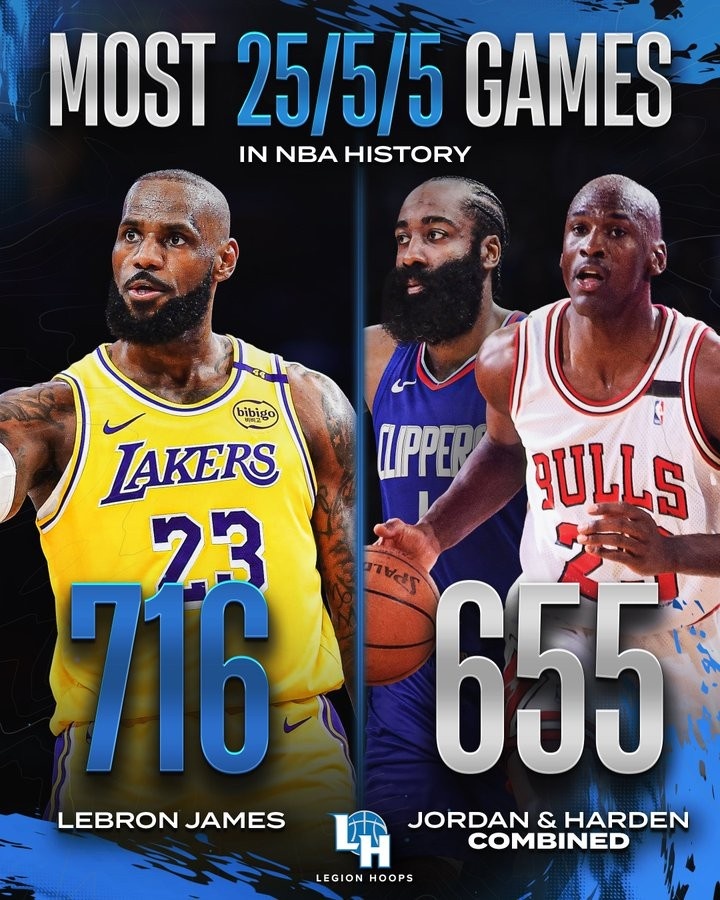 😲美媒晒25+5+5场次:詹姆斯716场 哈登和乔丹一共655场