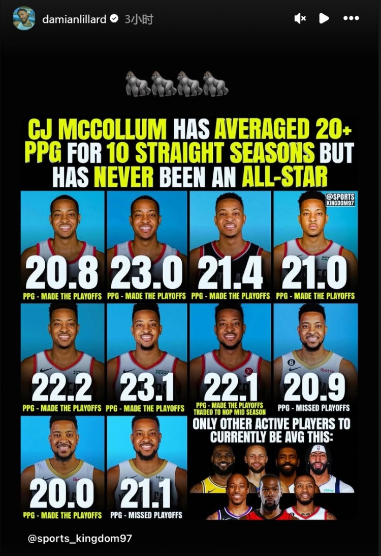 7月25日讯 今天,开拓者球星利拉德转发了一则关于CJ-麦科勒姆的数据报道,为老队友鸣不平。CJ在个人最近的连续10个赛...