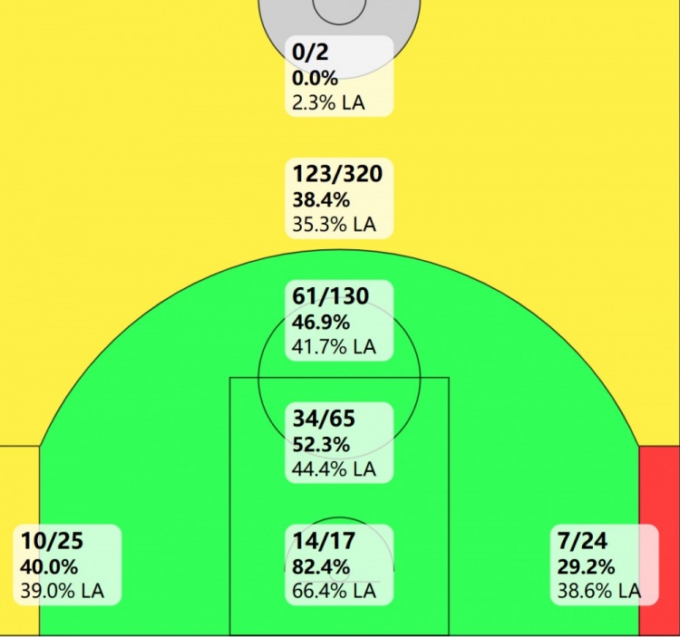 7月23日讯 克里斯-保罗签约快船,重回LA开启生涯第21个赛季。美媒晒出了保罗上赛季的投篮热图,他上赛季在三分线内的各...