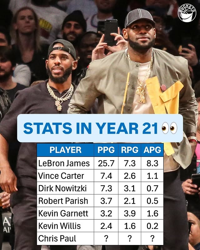 保罗将成为第七个!美媒列前六位球员第21个赛季数据:老詹25+7+8