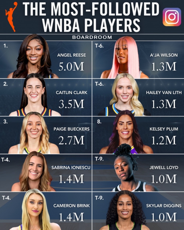 7月21日讯 美媒boardroom统计了WNBA球星的社媒粉丝数排行,并配文写到:一些女子篮球界的大牌球星正在Inst...